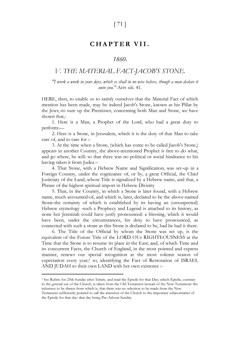 FIRST, that as, England is, in God’s providence in possession of a Certain Stone, called JACOB’S PILLOW, which is the Seat of the Coronation Throne of the Empire, cherished and protected by her, in a very special manner, as her Chiefest National Muniment; so also, if it be the case that the Stone be Jacob’s Pillow,
